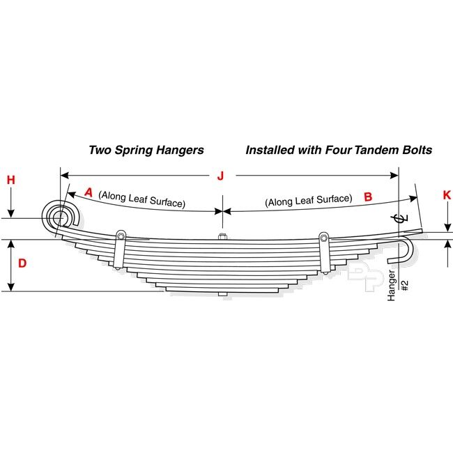 10 Leaf Spring – Width = 4 ; (A) 19 ; (B) 23-1/2 ; (D) 7-7/8 ; (H) 1-9/16 ; (J) 38 ; (K) 11/16 ; 65-70K Severe Service
